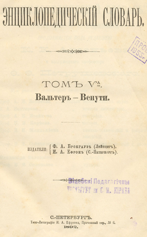 Энциклопедическiй словарь,.Т. 5 А : Вальтер - Венути / [под ред. К. К. Арсеньева, Ф. Ф. Петрушевскаго]. - Санкт-Петербург : Типо-Литографiя И. А. Ефрона : Изд. Ф. А. Брокгауз (Лейпциг), И. А. Ефрон (С.-Петербург) , 1892 . - с 469-940 с. : ил., [20] вкл. л. . - Библиогр. в конце ст. - На корешке переплета Т. 10.