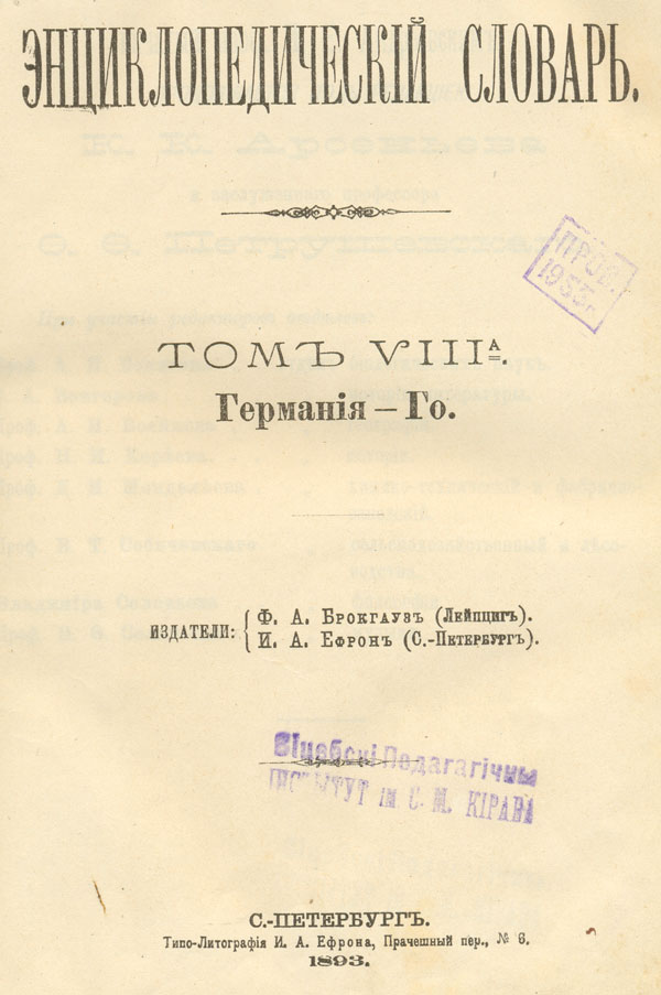 Энциклопедическiй словарь,.Т. 8 А : Германiя - Го / [под ред. К. К. Арсеньева, Ф. Ф. Петрушевскаго]. - Санкт-Петербург : Типо-Литографiя И. А. Ефрона : Изд. Ф. А. Брокгауз (Лейпциг), И. А. Ефрон (С.-Петербург) , 1893 . - с 479-958, 2, II с. : ил., [9] вкл. л., [2] вкл. цв. карт . - Библиогр. в конце ст. - На корешке переплета Т. 16