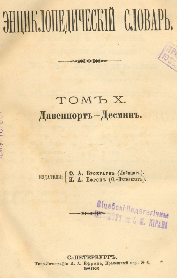 Энциклопедическiй словарь,.Т. 10 : Давенпорт - Десмин / [под ред. К. К. Арсеньева, Ф. Ф. Петрушевскаго]. - Санкт-Петербург : Типо-Литографiя И. А. Ефрона : Изд. Ф. А. Брокгауз (Лейпциг), И. А. Ефрон (С.-Петербург) , 1893 . - 480 с. : ил., [2] вкл. л. - Библиогр. в конце ст. - На корешке переплета Т. 19.