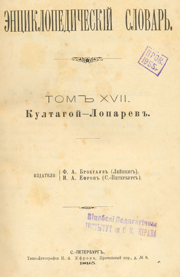 Энциклопедическiй словарь,.Т. 17 : Култагой - Лопарев / [под ред. К. К. Арсеньева, Ф. Ф. Петрушевскаго]. - Санкт-Петербург : Типо-Литографiя И. А. Ефрона : Изд. Ф. А. Брокгауз (Лейпциг), И. А. Ефрон (С.-Петербург) , 1895 . - 960, III с. : ил., [31] вкл. л., [1] вкл. цв. л., [6] вкл. цв. карт. - Библиогр. в конце ст.