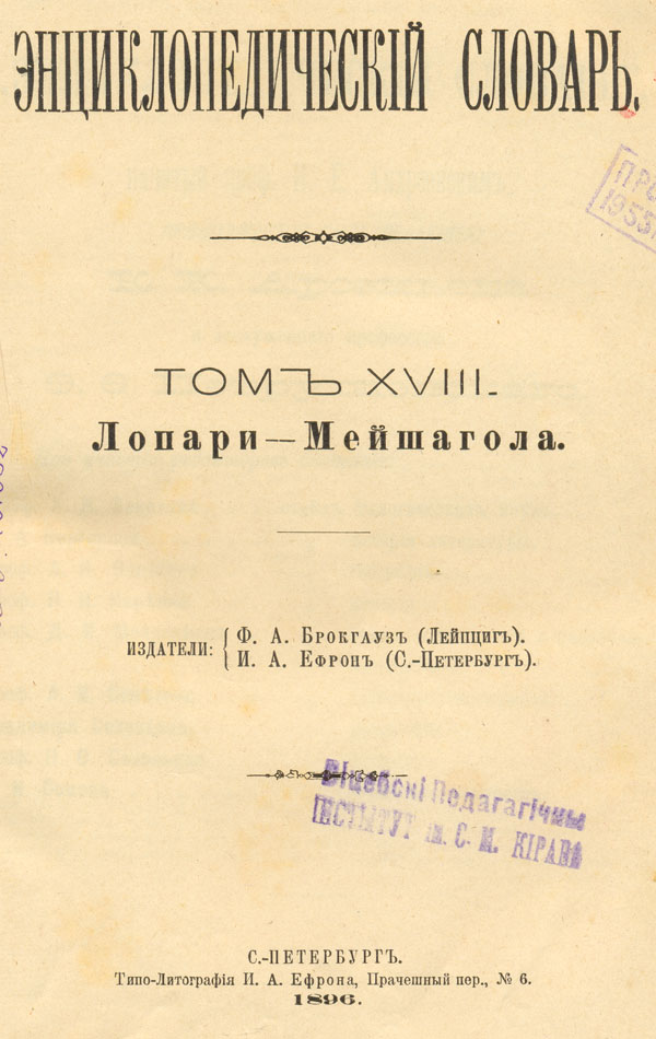 Энциклопедическiй словарь,.Т. 18 : Лопари - Мейшагола / [под ред. К. К. Арсеньева, Ф. Ф. Петрушевскаго]. - Санкт-Петербург : Типо-Литографiя И. А. Ефрона : Изд. Ф. А. Брокгауз (Лейпциг), И. А. Ефрон (С.-Петербург) , 1896 . - 958, III с. : ил., [28] вкл. л., [1] вкл. цв. л., [1] вкл. цв. карт. - Библиогр. в конце ст.