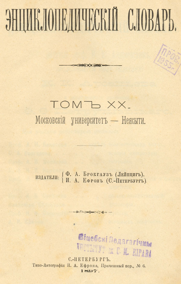 Энциклопедическiй словарь,.Т. 20 : Московскiй университет - Неясыти / [под ред. К. К. Арсеньева, Ф. Ф. Петрушевскаго]. - Санкт-Петербург : Типо-Литографiя И. А. Ефрона : Изд. Ф. А. Брокгауз (Лейпциг), И. А. Ефрон (С.-Петербург) , 1897 . - 960, IV с. : ил., [34] вкл. л., [2] вкл. цв. л., [1] вкл. цв. карт. - Библиогр. в конце ст.