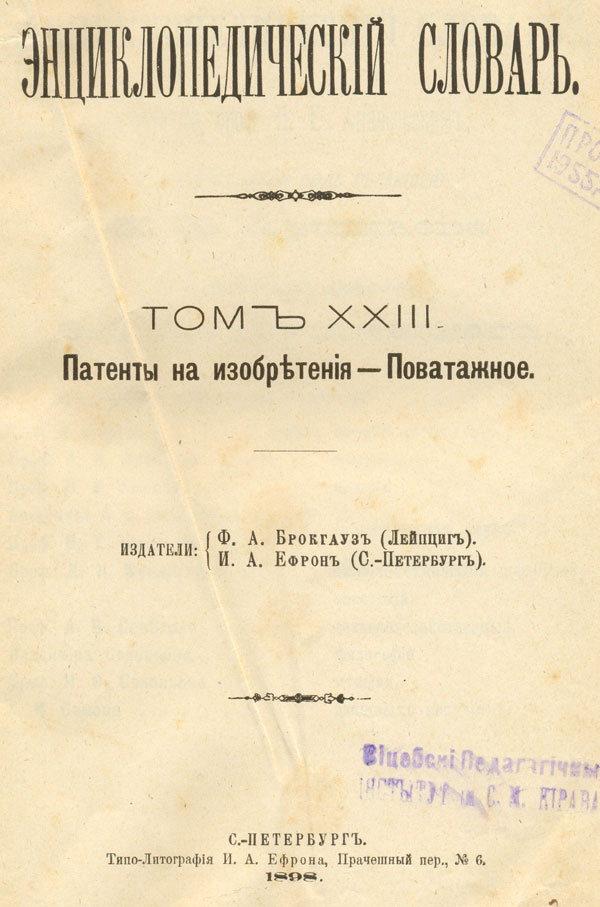 Энциклопедическiй словарь,.Т. 23 : Патенты на изобретенiя - Поватажное / [под ред. К. К. Арсеньева, Ф. Ф. Петрушевскаго]. - Санкт-Петербург : Типо-Литографiя И. А. Ефрона : Изд. Ф. А. Брокгауз (Лейпциг), И. А. Ефрон (С.-Петербург) , 1898 . - 958, II с. : ил., [35] вкл. л., [11] вкл. цв. карт. - Библиогр. в конце ст.