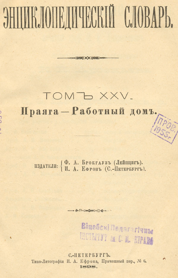 Энциклопедическiй словарь,.Т. 25 : Праяга - Работный дом / [под ред. К. К. Арсеньева, Ф. Ф. Петрушевскаго]. - Санкт-Петербург : Типо-Литографiя И. А. Ефрона : Изд. Ф. А. Брокгауз (Лейпциг), И. А. Ефрон (С.-Петербург) , 1898 . - 958, III с. : ил., [22] вкл. л., [8] вкл. цв. карт. - Библиогр. в конце ст.
