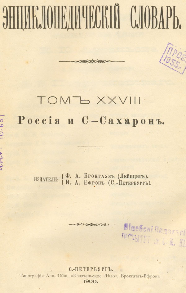 Энциклопедическiй словарь,.Т. 28 : Россiя и С - Сахарон / [под ред. К. К. Арсеньева, Ф. Ф. Петрушевскаго]. - Санкт-Петербург : Типографiя Акц. Общ. "Издательское Дело", Брокгауз-Ефрон : Изд. Ф. А. Брокгауз (Лейпциг), И. А. Ефрон (С.-Петербург) , 1900 . - с 421-874, V, 497 с. : ил., [18] вкл. л., [3] вкл. цв. л., [19] вкл. цв. карт. - Библиогр. в конце ст.