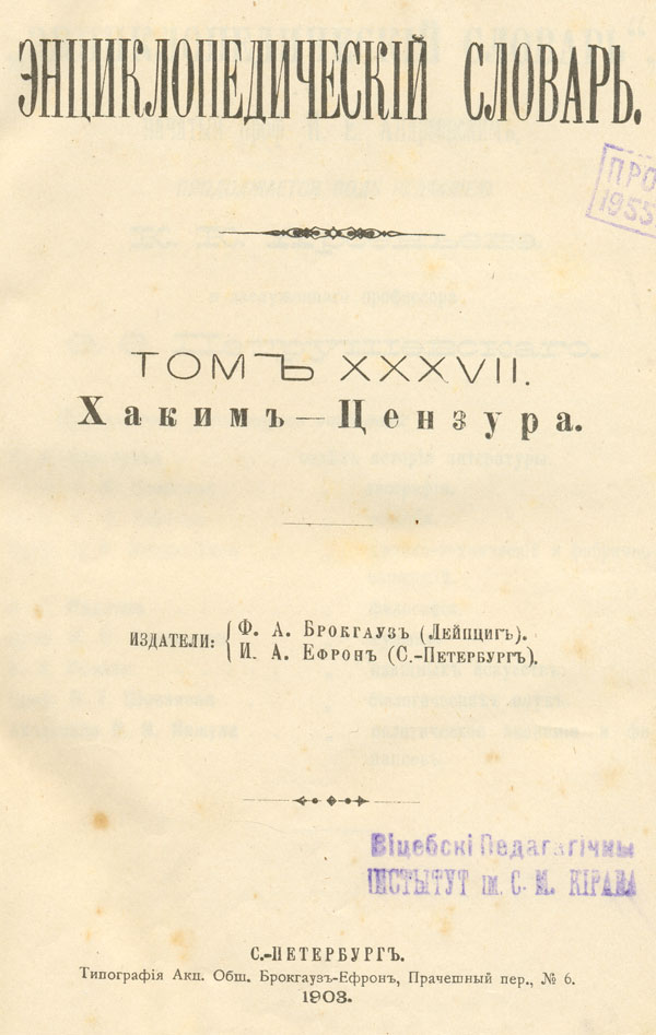 Энциклопедическiй словарь,.Т. 37 : Хаким - Цензура / [под ред. К. К. Арсеньева, Ф. Ф. Петрушевскаго]. - Санкт-Петербург : Типографiя Акц. Общ. Брокгауз-Ефрон : Изд. Ф. А. Брокгауз (Лейпциг), И. А. Ефрон (С.-Петербург) , 1903 . - 962, IV с. : ил., [29] вкл. л., [4] вкл. цв. л., [8] вкл. цв. карт. - Библиогр. в конце ст.