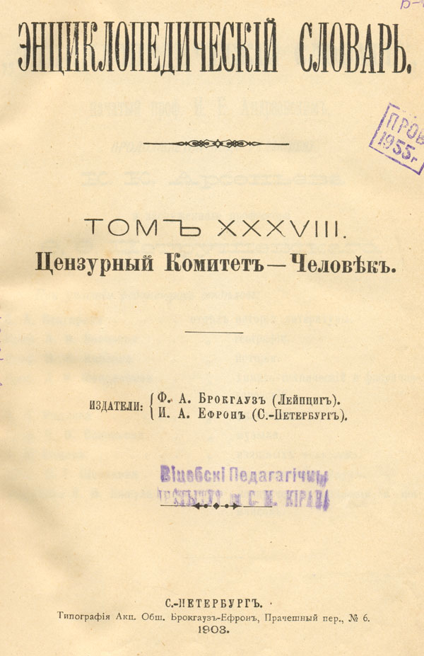 Энциклопедическiй словарь,.Т. 38 : Цензурный Комитет - Человек / [под ред. К. К. Арсеньева, Ф. Ф. Петрушевскаго]. - Санкт-Петербург : Типографiя Акц. Общ. Брокгауз-Ефрон : Изд. Ф. А. Брокгауз (Лейпциг), И. А. Ефрон (С.-Петербург) , 1903 . - 482 с. : ил., [13] вкл. л. - Библиогр. в конце ст. - На корешке переплета Т. 75.