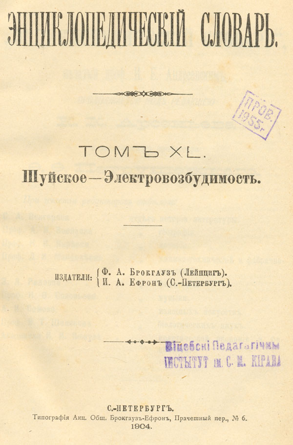 Энциклопедическiй словарь,.Т. 40 : Шуйское - Электровозбудимость / [под ред. К. К. Арсеньева, Ф. Ф. Петрушевскаго]. - Санкт-Петербург : Типографiя Акц. Общ. Брокгауз-Ефрон : Изд. Ф. А. Брокгауз (Лейпциг), И. А. Ефрон (С.-Петербург) , 1904 . - 4, 468 с. : ил., [14] вкл. л. - Библиогр. в конце ст. - На корешке переплета Т. 79.