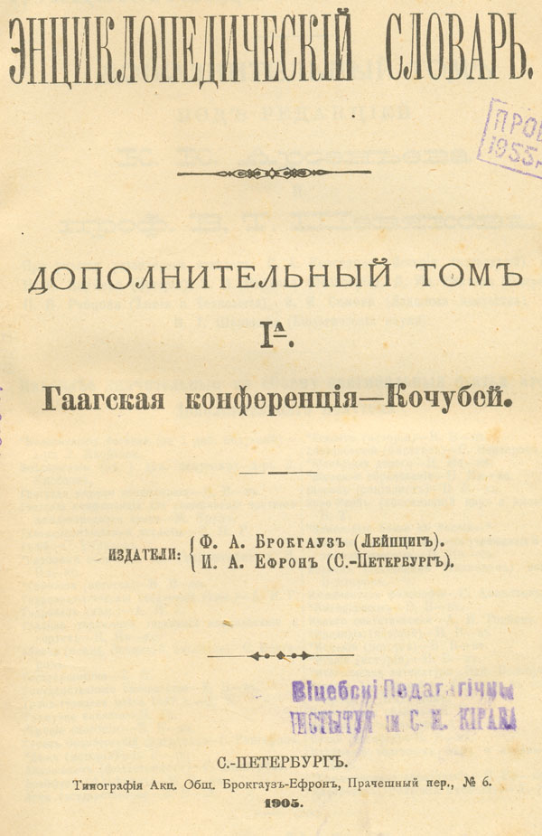 Энциклопедическiй словарь,.Дополнительный том 1 А : Гаагская конференцiя - Кочубей / [под ред. К. К. Арсеньева, В. Т. Шевякова]. - Санкт-Петербург : Типографiя Акц. Общ. Брокгауз-Ефрон : Изд. Ф. А. Брокгауз (Лейпциг), И. А. Ефрон (С.-Петербург) , 1905 . - С. 481-959 : ил., [2] вкл. л., [4] вкл. цв. карт. - Библиогр. в конце ст. - На корешке переплета [Т. 2/Д].