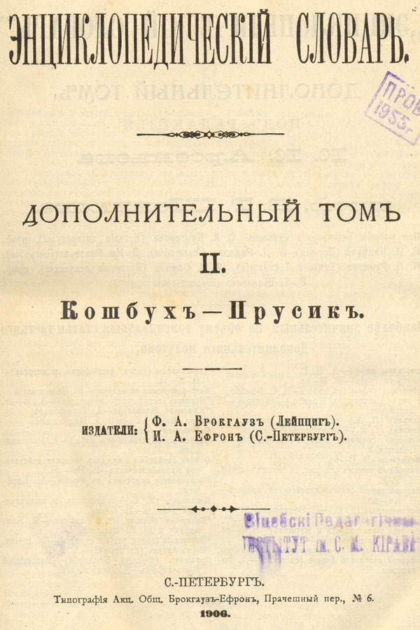 Энциклопедическiй словарь,.Дополнительный том 2 : Кошбух - Прусик / [под ред. К. К. Арсеньева, В. Т. Шевякова]. - Санкт-Петербург : Типографiя Акц. Общ. Брокгауз-Ефрон : Изд. Ф. А. Брокгауз (Лейпциг), И. А. Ефрон (С.-Петербург) , 1906 . - 480 с. : ил., [7] вкл. л., [4] вкл. цв. карт. - Библиогр. в конце ст. - На корешке переплета [Т. 3/Д].
