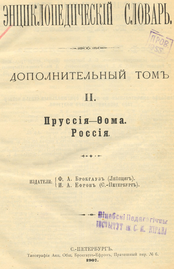 Энциклопедическiй словарь,.Дополнительный том 2 : Пруссiя - Фома. Россiя / [под ред. К. К. Арсеньева, В. Т. Шевякова]. - Санкт-Петербург : Типографiя Акц. Общ. Брокгауз-Ефрон : Изд. Ф. А. Брокгауз (Лейпциг), И. А. Ефрон (С.-Петербург) , 1907 . - с 480-934, XCVIII с. : ил., [22] вкл. л., [10] вкл. цв. карт. - Библиогр. в конце ст. - На корешке переплета [Т. 4/Д].