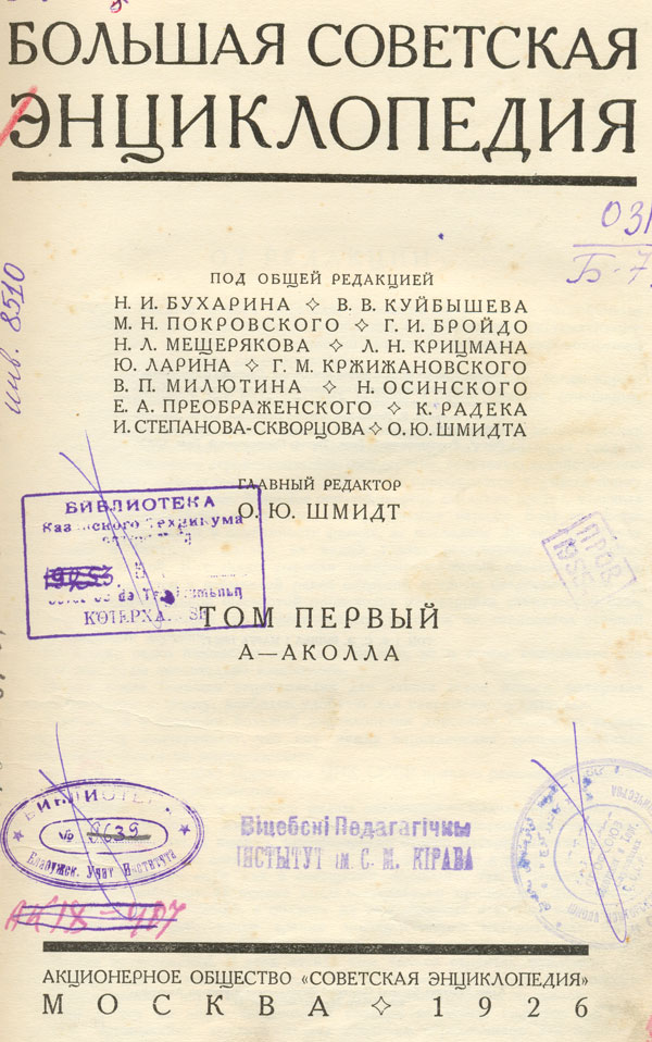 Большая Советская Энциклопедия.Т. 1 : А - Аколла / под общ. ред. И. И. Бухарина, В. В. Куйбышева, М. Н. Покровского [и др.] ; гл. ред. О. Ю. Шмидт. - Москва : Советская Энциклопедия, 1926. - 832 стб. : ил., [10] вкл. л., [5] вкл. цв. л. - Библиогр. в конце ст.