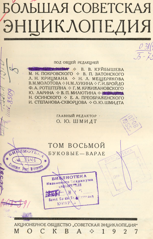 Большая Советская Энциклопедия.Т. 8 : Буковые - Варле / под общ. ред. И. И. Бухарина, В. В. Куйбышева, М. Н. Покровского [и др.] ; гл. ред. О. Ю. Шмидт. - Москва : Советская Энциклопедия, 1927. - 816 стб. : ил., [13] вкл. л., [1] вкл. цв. л., [10] вкл. цв. карт. - Библиогр. в конце ст.