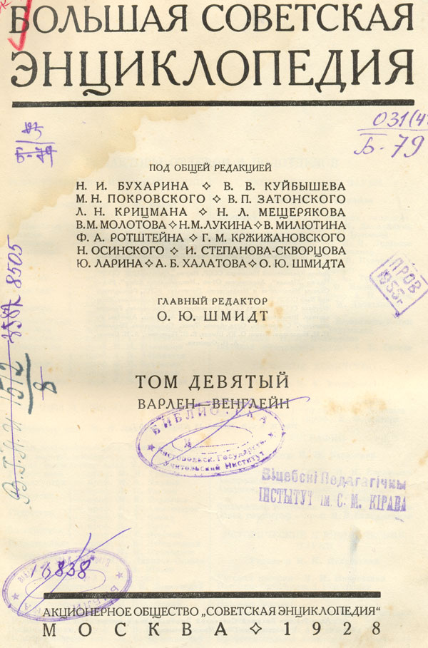 Большая Советская Энциклопедия.Т. 9 : Варлен - Венглейн / под общ. ред. И. И. Бухарина, В. В. Куйбышева, М. Н. Покровского [и др.] ; гл. ред. О. Ю. Шмидт. - Москва : Советская Энциклопедия, 1928. - 852 стб. : ил., [20] вкл. л., [11] вкл. цв. карт . - Библиогр. в конце ст.