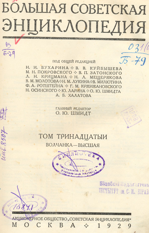 Большая Советская Энциклопедия.Т. 13 : Волчанка - Высшая / под общ. ред. И. И. Бухарина, В. В. Куйбышева, М. Н. Покровского [и др.] ; гл. ред. О. Ю. Шмидт. - Москва : Советская Энциклопедия, 1929. - 806 стб. : ил., [11] вкл. л., [1] вкл. цв. л., [2] вкл. цв. карт. - Библиогр. в конце ст.
