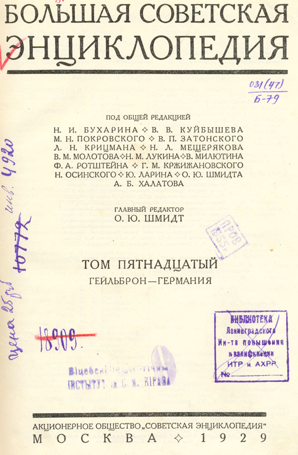 Большая Советская Энциклопедия.Т. 15 : Гейльброн - Германия / под общ. ред. И. И. Бухарина, В. В. Куйбышева, М. Н. Покровского [и др.] ; гл. ред. О. Ю. Шмидт. - Москва : Советская Энциклопедия, 1929. - 826 стб. : ил., [13] вкл. л., [22] вкл. цв. карт. - Библиогр. в конце ст.