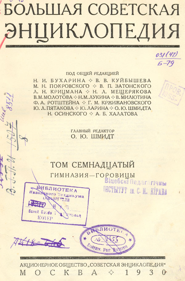 Большая Советская Энциклопедия.Т. 17 : Гимназия - Горовицы / под общ. ред. И. И. Бухарина, В. В. Куйбышева, М. Н. Покровского [и др.] ; гл. ред. О. Ю. Шмидт. - Москва : Советская Энциклопедия, 1930. - 812 стб. : ил., [16] вкл. л., [3] вкл. цв. л. - Библиогр. в конце ст.