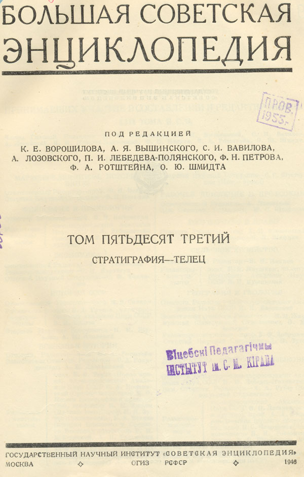 Большая Советская Энциклопедия.Т. 53 : Стратиграфия - Телец / под ред. К. Е. Ворошилова, А. Я. Вышинского, С. И. Вавилова [и др.] . - Москва : Советская Энциклопедия, 1946. - 784 стб. : ил., [8] вкл. л., [1] вкл. цв. л., [2] вкл. цв. карт. - Библиогр. в конце ст.