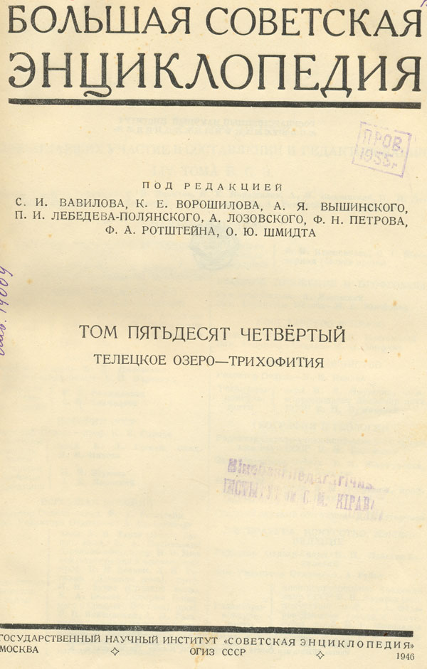Большая Советская Энциклопедия.Т. 54 : Телецкое озеро - Трихофития / под ред. С.И. Вавилова, К.Е. Ворошилова, А.Я. Вышинского [и др.] . - Москва : Советская Энциклопедия, 1946. - 832 стб. : ил., [13] вкл. л. - Библиогр. в конце ст.