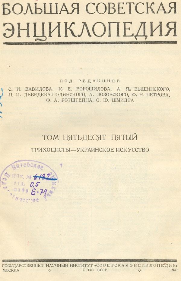 Большая Советская Энциклопедия.Т. 55 : Трихоцисты - Украинское искусство / под ред. С. И. Вавилова, К. Е. Ворошилова, А. Я. Вышинского [и др.] . - Москва : Советская Энциклопедия, 1947. - 990 стб. : ил., [15] вкл. л., [5] вкл. цв. карт. - Библиогр. в конце ст.