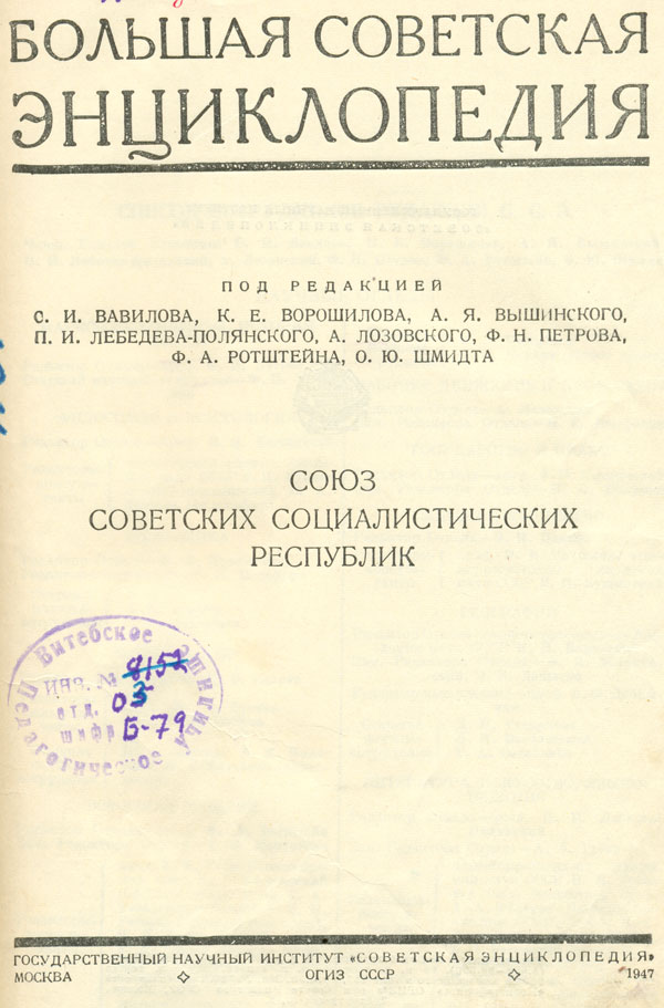 Большая Советская Энциклопедия.Союз Советских Социалистических Республик / под ред. С. И. Вавилова, К. Е. Ворошилова, А. Я. Вышинского [и др.] . - Москва : Советская Энциклопедия, 1947. - 1946 стб., XL c. : ил., [15] вкл. л., [2] вкл. цв. л., [25] вкл. цв. карт. - Библиогр. : с. XLI-LXXX.