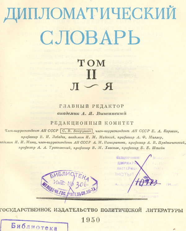 Дипломатический словарь.Т. 2 : Л - Я / гл. ред. ... А. Я. Вышинский ; ред. комитет : С. В. Бахрушин, Е. А. Коровин, В. И. Лебедев [и др.]. - Москва : Гос. изд-во полит. лит., 1950. - XXXIV, 996 стб. - Библиогр. в конце статей. - Указ.: стб. X-XXXIV.