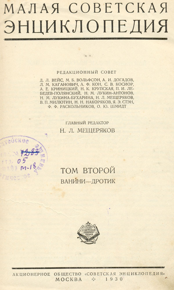 Малая советская энциклопедия.Т. 2 : Ванини - Дротик / ред. совет : Д. Л. Вейс, М. Б. Вольфсон, А. И. Догадов [и др.] ; гл. ред. Н. Л. Мещеряков. - Москва : Советская энциклопедия, 1930. - 960 стб. : ил., [2] вкл. ил., [4] карты . - Библиогр. в конце статей.