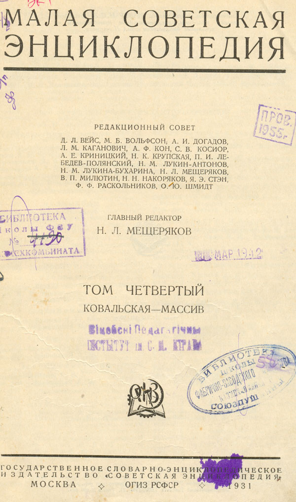 Малая советская энциклопедия.Т. 4 : Ковальская - Массив / ред. совет : Д. Л. Вейс, М. Б. Вольфсон, А. И. Догадов [и др.] ; гл. ред. Н. Л. Мещеряков. - Москва : ОГИЗ, Советская энциклопедия, 1931. - 956 стб. : ил., портр., [4] вкл. л., [1] вкл. цв. л., [2] карты. - Библиогр. в конце статей.