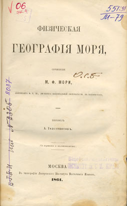Мори, М. Ф. Физическая географiя моря / сочиненiе М.В. Мори, лейтенанта Ф.С.Ш., директора нацiональной обсерваторiи, в Вашингтоне ; перевел [с англ.] А. Толстопятов. - Москва: В типографiи Лазаревскаго Института Восточных Языков, 1861. - XXIV, 364 с., с картами и политипажами, [8] вкл. л. - Библиогр.: с. XV-XVI.