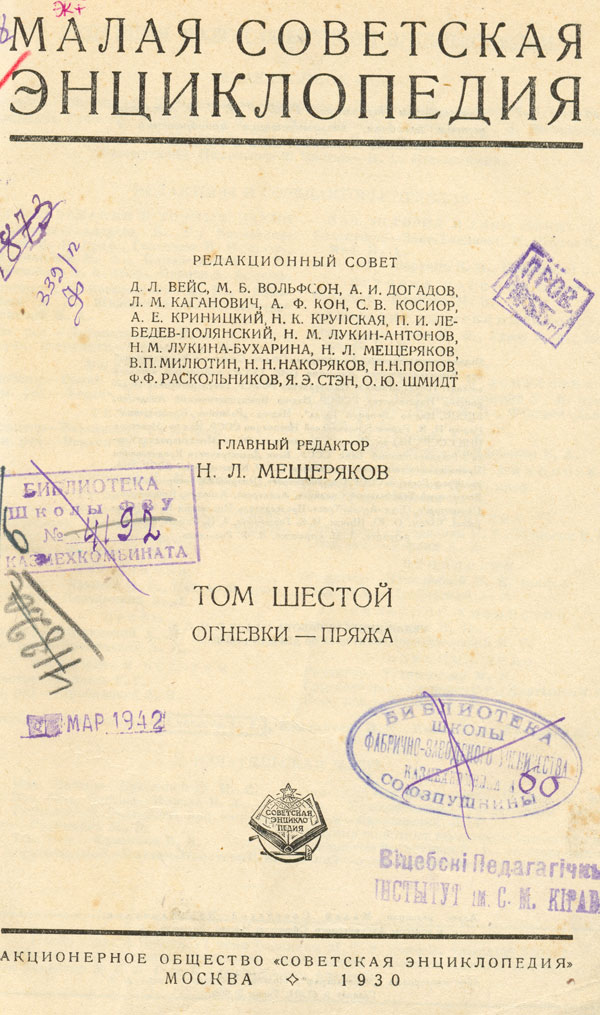 Малая советская энциклопедия.Т. 6 : Огневки - Пряжа / ред. совет : Д. Л. Вейс, М. Б. Вольфсон, А. И. Догадов [и др.] ; гл. ред. Н. Л. Мещеряков. - Москва : Советская энциклопедия, 1930. - 990 стб. : ил., [6] вкл. л, [1] вкл. цв. л., портр., карта. - Библиогр. в конце статей.