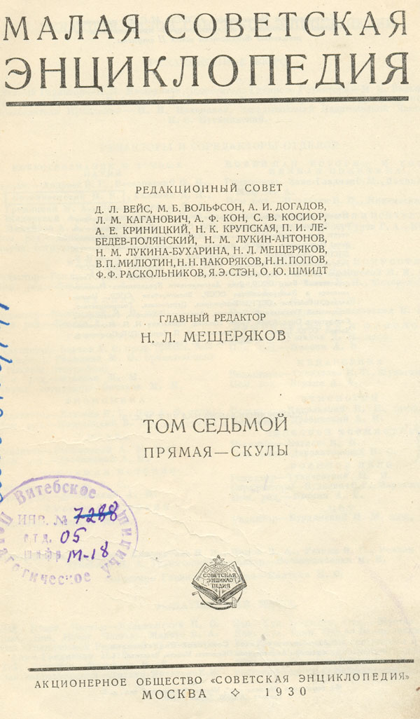 Малая советская энциклопедия.Т. 7 : Прямая - Скулы / ред. совет : Д. Л. Вейс, М. Б. Вольфсон, А. И. Догадов [и др.] ; гл. ред. Н. Л. Мещеряков. - Москва : Советская энциклопедия, 1930. - 966 стб. : ил., [5] вкл.л., [3] вкл. цв. л., [5] карт. - Библиогр. в конце статей.