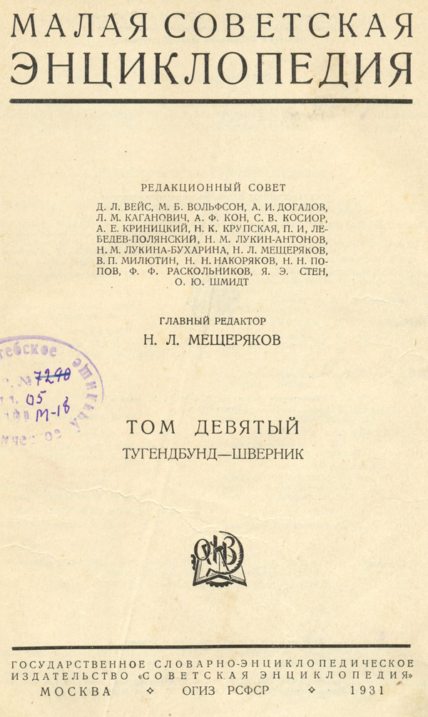 Малая советская энциклопедия.Т. 9 : Тугендбунд - Шверник / ред совет : Д. Л. Вейс, М. Б. Вольфсон, А. И. Догадов [и др.] ; гл. ред. Н. Л. Мещеряков. - Москва : ОГИЗ, Советская энциклопедия, 1931. - 900 стб. : ил., [5] вкл. цв. карт, [8] вкл. л. - Библиогр. в конце статей. - Экз. деф.: нет стб.: 381-384.