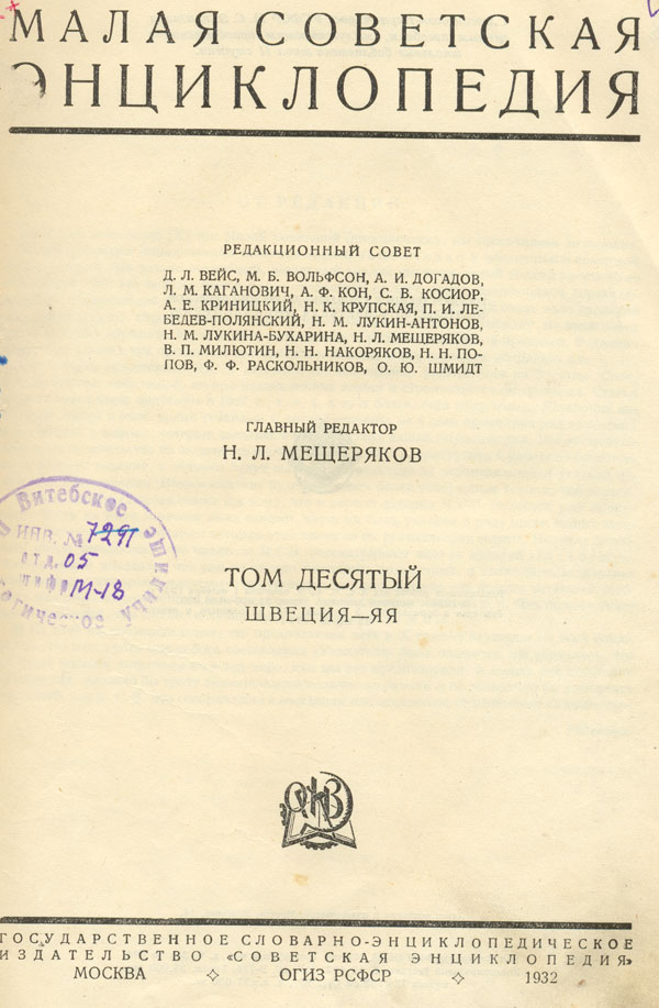 Малая советская энциклопедия.Т. 10 : Швеция - Яя / ред совет : Д. Л. Вейс, М. Б. Вольфсон, А. И. Догадов [и др.] ; гл. ред. Н. Л. Мещеряков. - Москва : ОГИЗ, Советская энциклопедия, 1932. - 480 стб. : ил., портр., [2] вкл. цв. карты. - Библиогр. в конце статей.