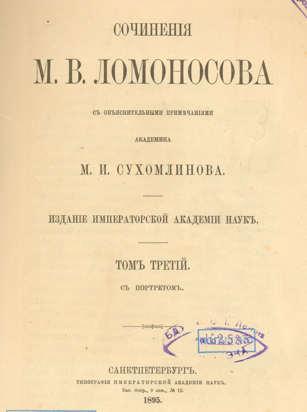 Ломоносов М. В. Сочиненiя : с портретом. Т. 3 / М. В. Ломоносов ; с объяснительными примечанiями ...М. И. Сухомлинова. - Санктпетербург : Изданiе Императорской Академiи Наук, 1895 ( : Типографiя Императорской Академіи Наук). - XI, 352, 567 с. . - Библиогр. в обл. ссылок.