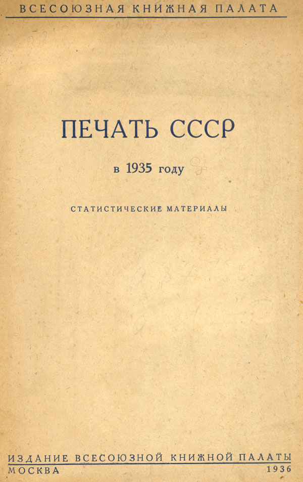Печать СССР в 1935 году: статистические материалы / сост. под рук. и со вступ. ст. К. И. Пропиной ; под ред. В. И. Соловьева ; Всесоюзная книжная палата. - 4-е изд. - Москва : Изд. Всесоюзной книжной палаты, 1936. - X, 42, 110 с., табл.