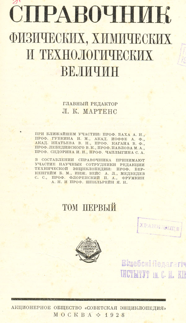 Справочник физических, химических и технологических величин.Т. 1 / гл. ред. Л. К. Мартенс ; при участии А. Н. Баха, И. М. Губкина, А. Ф. Иоффе [и др.] . - Москва : Советская энциклопедия, 1928. - 480 с. - Библиогр. в конце статей. - Алфавит. указ. минералов : с. 216 - 218. - Загл. обл. : Техническая энциклопедия.