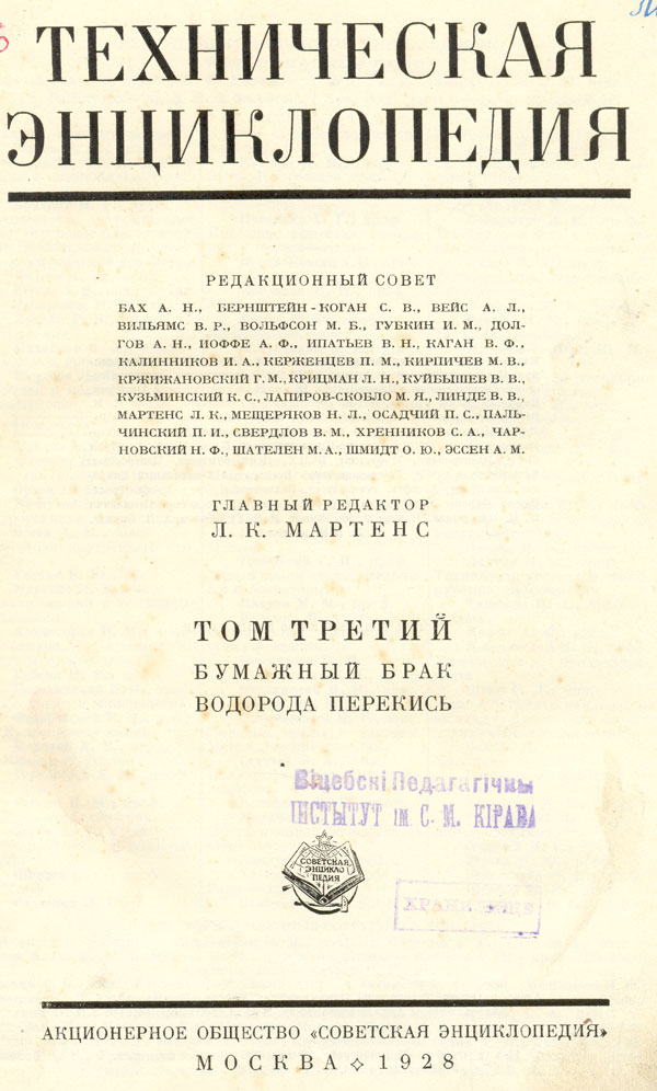 Техническая энциклопедия.Т. 3 : Бумажный брак - Водорода перекись / гл. ред. Л. К. Мартенс ; ред. совет : А. Н. Бах, С. В. Бернштейн-Коган, А. Л. Вейс [и др.]. - Москва : Советская энциклопедия, 1928. - 952 стб. : ил., [5] вкл. л., [2] вкл. цв. карт. - Библиогр. в конце статей. - Предмет. указ. : 4 с. в конце книги.