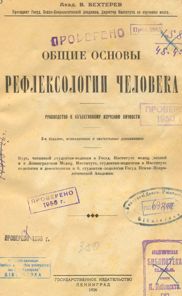 Общие основы рефлексологии человека. Руководство к объективному изучению личности : курс, читанный студентам-медикам в Гос. Институте мед. знаний и в Ленинградском мед. ин-те, студентам-педагогам в Институте педологии и дефектологии и б. студентам-педологам Гос. Психо-Неврологической Академии / В. Бехтерев. - 3-е изд., испр. и доп. - Ленинград : Госиздат, 1926. - II, 423 с. : ил. - Библиогр.: с. 411-418.
