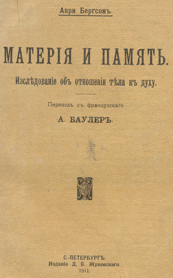 Матерiя и память. Изследованiе об отношенiи тела к духу / А. Бергсон ; перевод с французскаго А. Баулера. - С.-Петербург : Изданiе Д. Е. Жуковскаго, 1911. - VIII, 268 с. - Библиогр. в обл. ссылок.