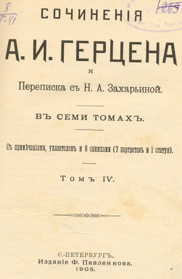 Сочиненiя и переписка с Н. А. Захарьиной. Т. 6 / А. И. Герцен. - С.-Петербург : Изданiе Ф. Павленкова, 1905. - VI, 400 с. Сигла хранения: фрк Оглавление