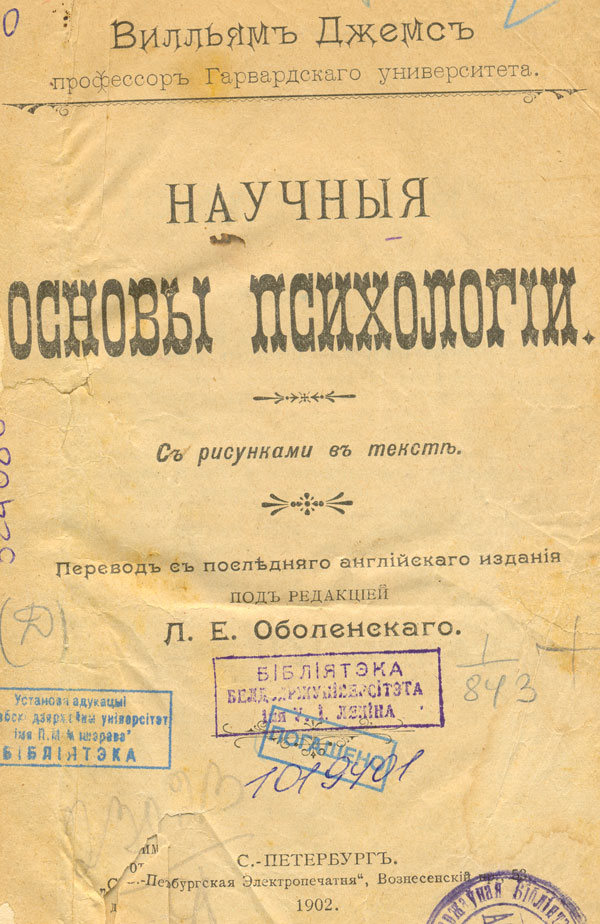 Научныя основы психологіи : с рисунками в тексте / В. Джемс ; перевод с последняго англiйскаго изданiя под редакцiей Л. Е. Оболенскаго. - С.-Петербург : С.-Петербургская Электропечатня, 1902. - 370, V с. - Экз. деф.: с. 5-12 после. с. 54.