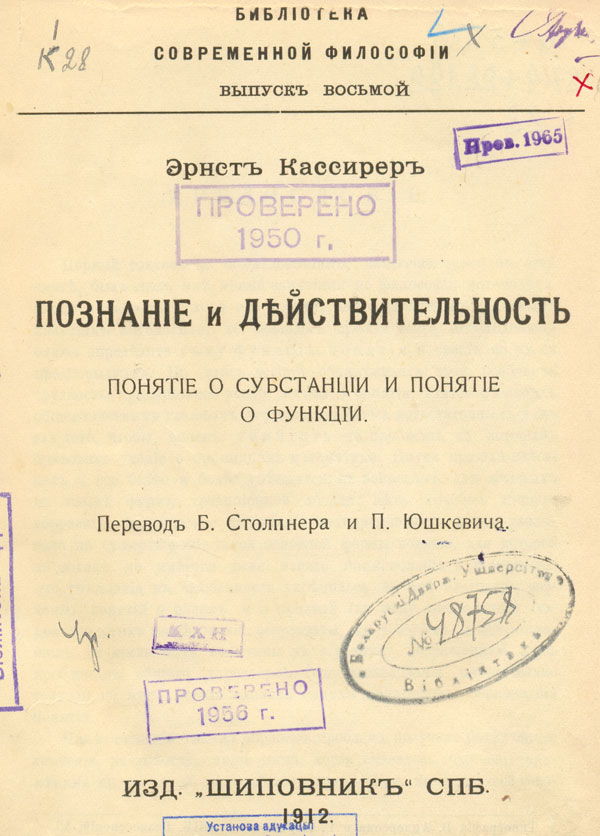 Познанiе и действительность. Понятiе о субстанцiи и понятiе о функцiи / Э. Кассирер ; перевод Б. Столпнера и П. Юшкевича. - СПБ. : Шиповник, 1912. - 454 с. - (Библиiотека современной философiи ; Вып. 8). - Библиогр. в обл. ссылок.
