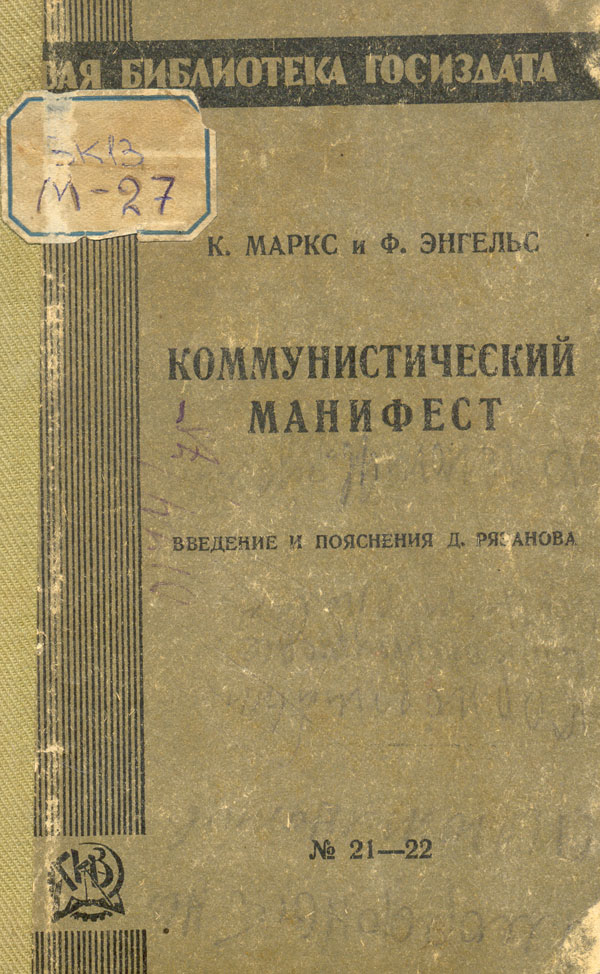 Коммунистический Манифест / К. Маркс, Ф. Энгельс ; введение и пояснения Д. Рязанова. - Москва : Госиздат, [1929]. - 127 с. - (... библиотека Госиздата ; № 21-22). - Экз. деф.: нет тит. л., описание составлено по всей книге.