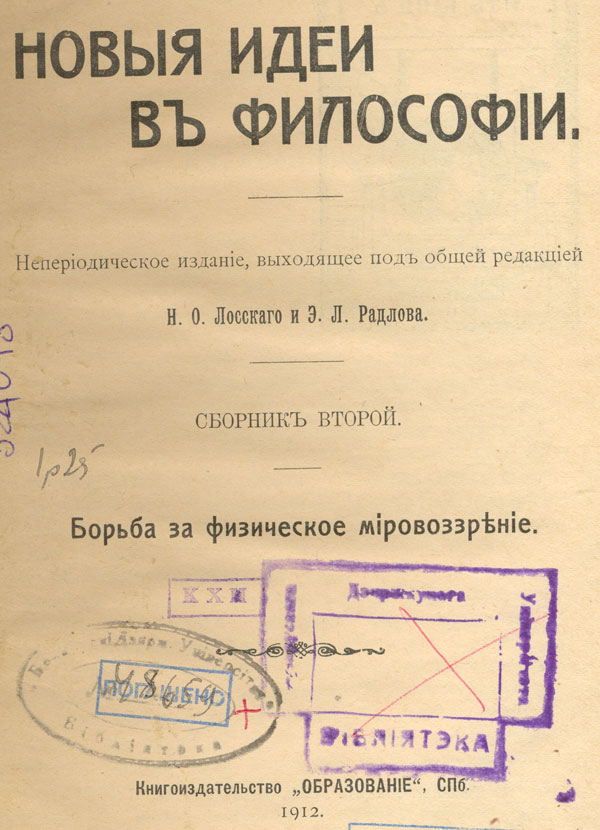 Новыя идеи в философіи.Сб. 2 : Борьба за физическое міровоззреніе / неперiодическое изданiе, выходящее под общей редакцiей Н. О. Лосскаго и Э. Л. Радлова. - С.-Петербург : Образованіе, 1912 ( : Типо-лит. "Энергія"). - 191 с. - Библиогр. на с.189-190 и в обл. ссылок.