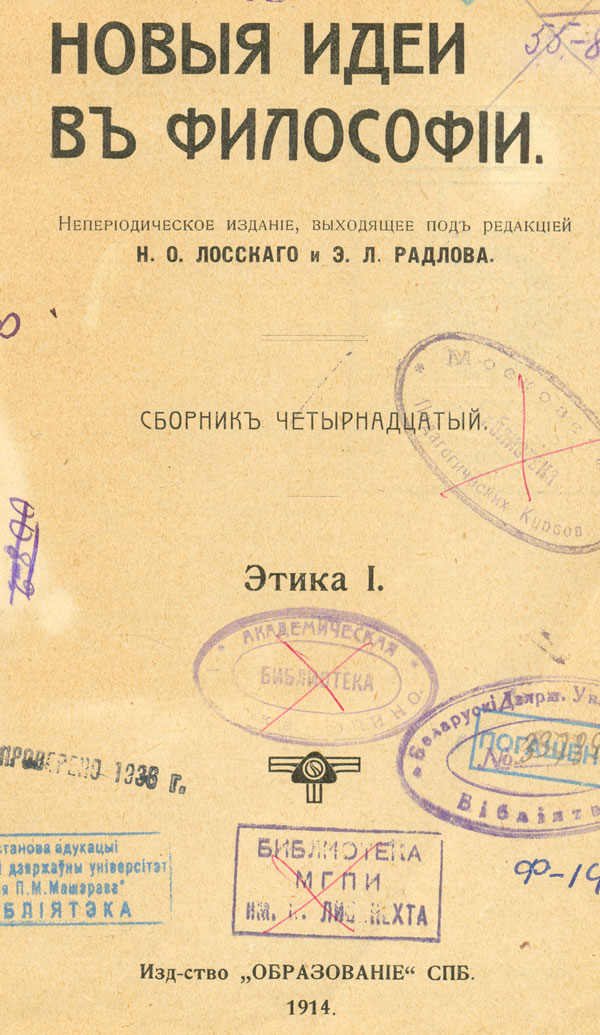 Новыя идеи в философіи.Сборник 14 : Этика І / неперiодическое изданiе, выходящее под редакцiей Н. О. Лосскаго и Э. Л. Радлова. - С.-Петербург : Образованіе, 1914 ( : Типографія Е. М. Малаховскаго). - 172 с. - Библиогр. в обл. ссылок.