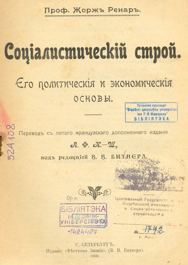 Соцiалистическій строй. Его политическiя и экономическiя основы / Ж. Ренар ; перевод с пятаго французскаго дополненнаго изданiя А. Ф. К.-Ш. ; под редакцiей В. В. Битнера. - С.-Петербург : Изданiе "Вестника Знанiя" (В. В. Битнера), 1906. - 96 с. : ил.