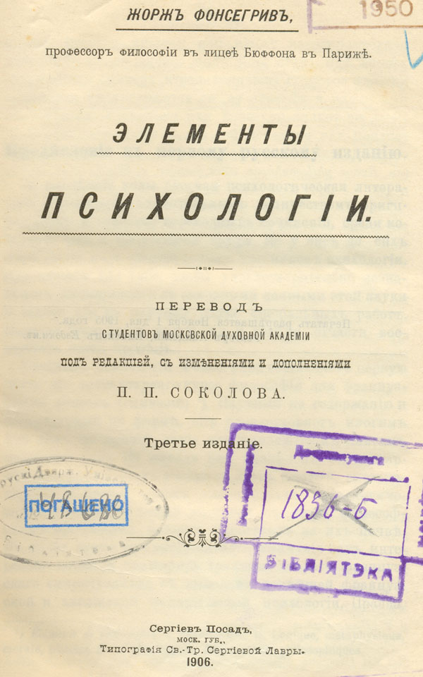Элементы психологіи / Ж. Фонсегрив ; перевод студентов Московской Духовной Академiи под редакцiей, с измененiями и дополненiями П. П. Соколова. - Третье изданiе. - Сергіев Посад, 1906 ( : Типографія Св.-Тр. Сергіевой Лавры). - XVI, 384 с. : ил. - Библиогр. в конце глав.