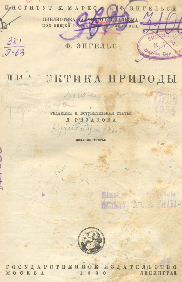 Диалектика природы / Ф. Энгельс ; Ин-т К. Маркса и Ф. Энгельса ; ред. и вступит. статья Д. Рязанова. - Изд. 3-е. - Москва ; Ленинград : Гос. изд.-во, 1930. - 380 с. - (Библиотека научного социализма / под общ. ред. Д. Рязанова). - Библиогр.: с. 379 -380. - Предм. указ.: с. 364 - 378.