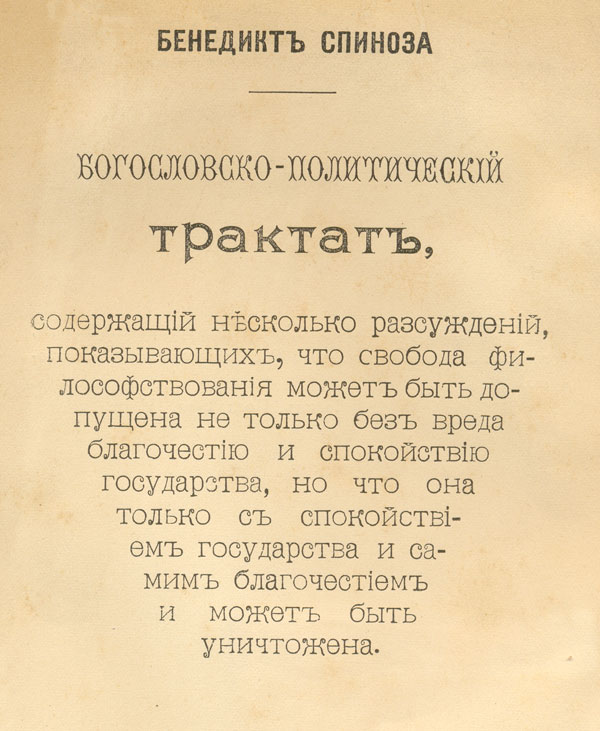 Богословско-политическiй трактат / Б. Спиноза ; Пер. с латин. - Казань : Типо-литографiя Императорскаго Университета, 1906. - IV, 440, IV c. Сигла хранения: фрк Введение Оглавление