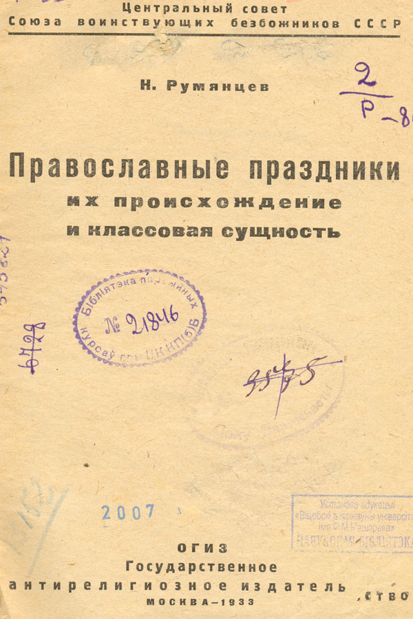 Православные праздники, их происхождение и классовая сущность / Н. Румянцев ; Центр. совет Союза воинствующих безбожников СССР. - Москва : ОГИЗ, Гос. антирелигиозное изд-во, 1933. - 296 с. : ил.